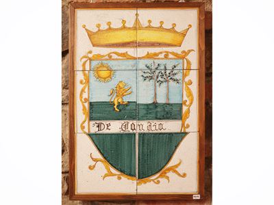 Stemma nobiliare in maiolica, cm 63x43, con cornice in legno