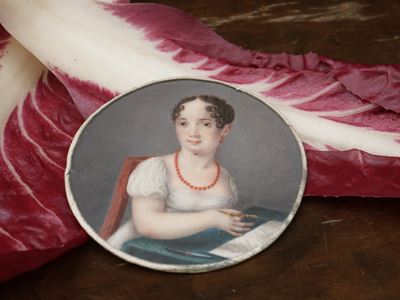Scuola italiana del XVIII secolo, Autoritratto al cavalletto con gatto, miniatura circolare