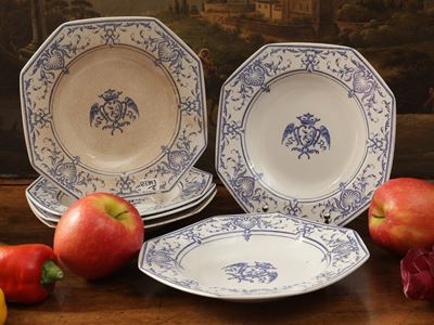 Serie di sei piatti fondi in terraglia con decorazione a grottesche e stemma nobiliare