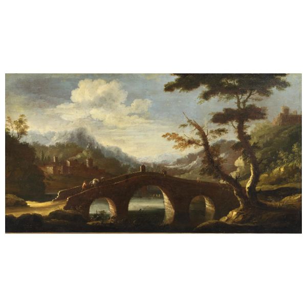 Nicola Viso, Paesaggio fluviale con ponte e figure, olio su tela