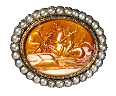 A Fine Neoclassical Carnelian Intaglio Set In A Gold Chiseled Brooch With Pearls. Mythological Sc...