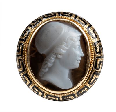 A Neoclassical Agate Cameo Set In A Gold And Black Enamel Ring.