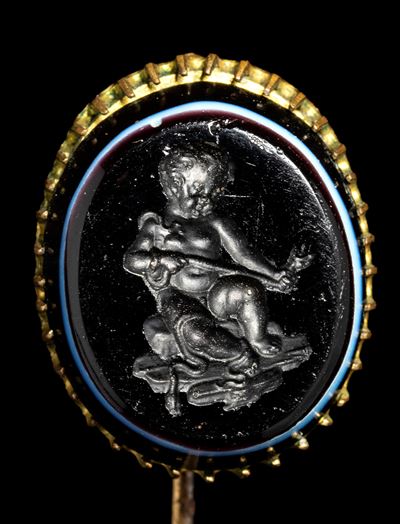A Dark Glass Paste Impression Set In A Gold Stick Pin. Hercules As A Child Killing The Snakes