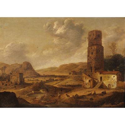 Scuola italiana, Paesaggio con figure, olio su tela