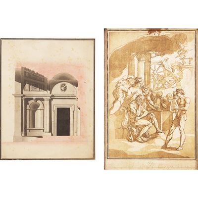 Artisti italiani del XVIII-XIX secolo, Architettura e Orfeo, due stampe acquerellate