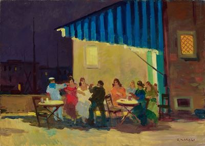 Renato Natali, Caffè al porto, Livorno, olio su tela, cm 50x70