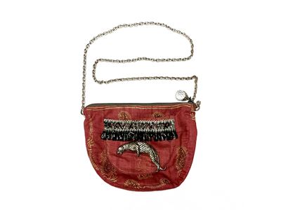Borsetta in seta rosa antico, pezzo unico decorato con passamaneria e pantera in metallo brunito
