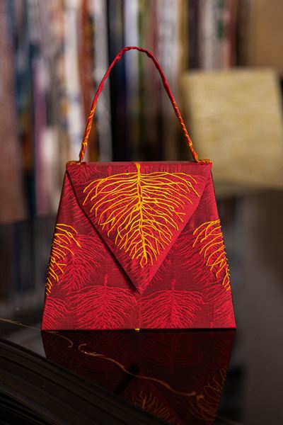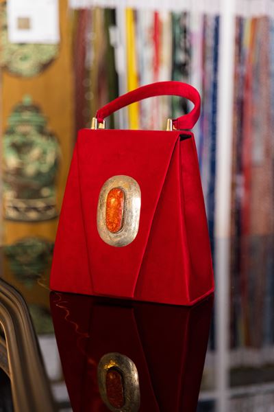 Borsa Lavi Bags realizzata a mano in velluto rosso con gioiello decorativo centrale in ottone cro...