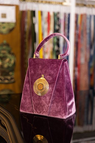 Borsa Lavi Bags realizzata a mano in velluto viola con pietra in resina