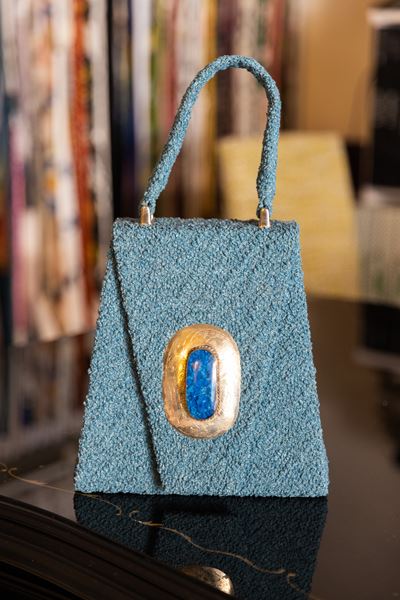 Borsa Lavi Bags realizzata a mano in tessuto bouclé con gioiello in ottone cromato con pietra azz...