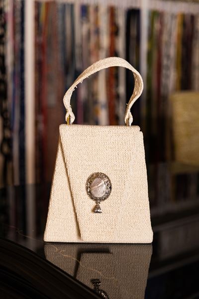 Borsa Lavi Bags realizzata a mano in tessuto cotone con ricami in lurex con gioiello in ottone cr...