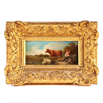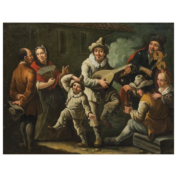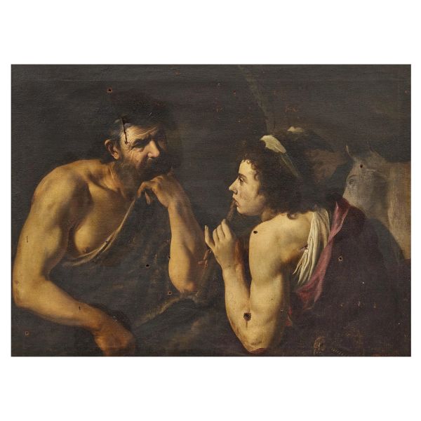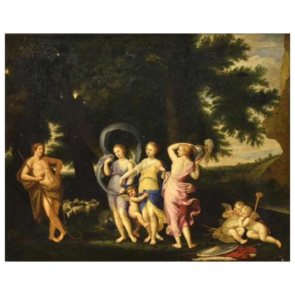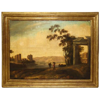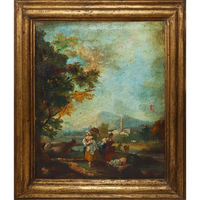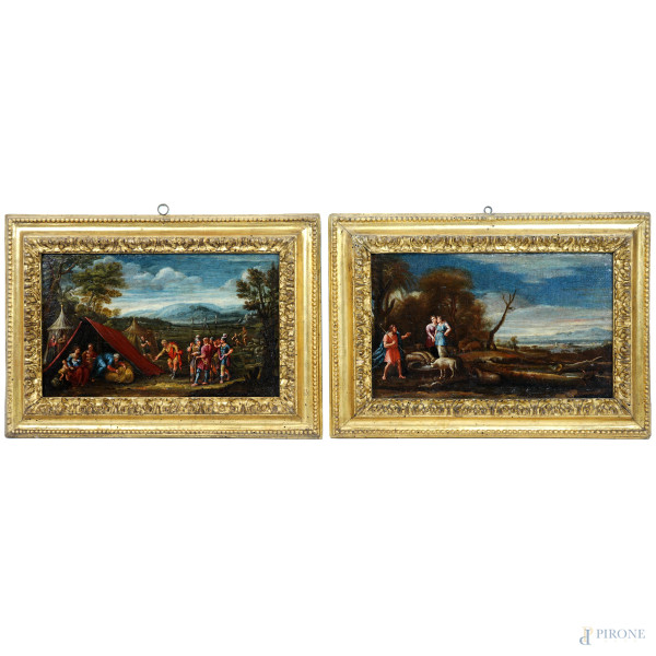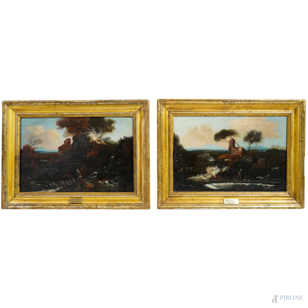 Scuola napoletana del XVII secolo, Coppia di paesaggi con figure, olio su tela, cm 22,8x32,5, ent...