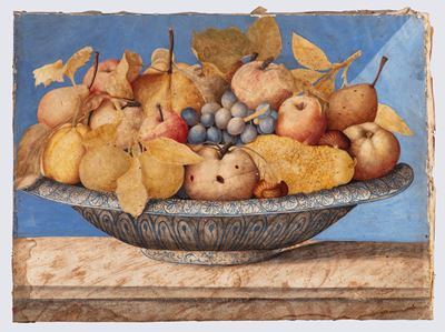 Mele, pere, uva, castagne e altri frutti in un'alzata di ceramica bianca e blu su un piano di pie...