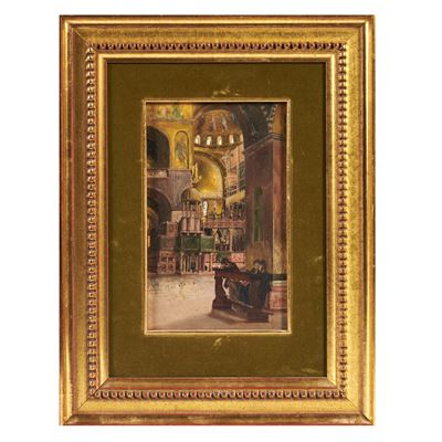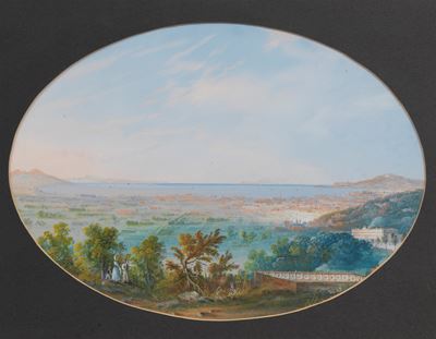 "Veduta di Napoli con il Golfo e il Palazzo Reale di Procida", antica gouache napoletana ovale di...