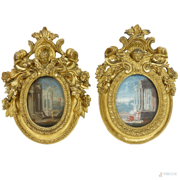 Scuola napoletana del XVII-XVIII secolo, coppia di vedute marine con capricci architettonici e fi...