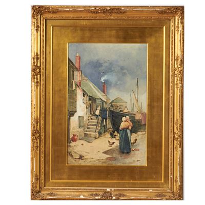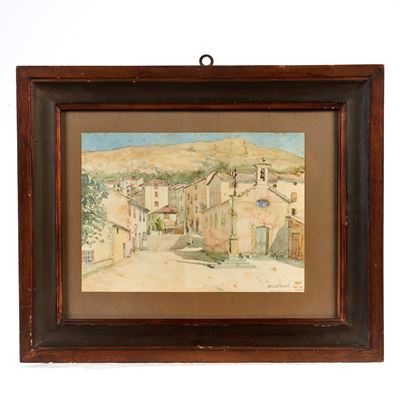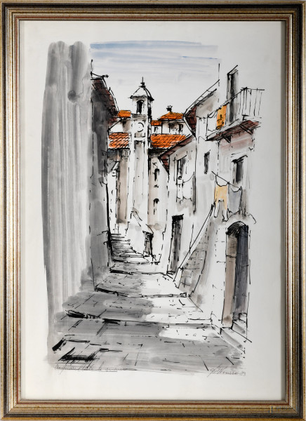 Scorcio DI Paese, Stampa Acquerellata A Mano, XX Secolo, Firmato In Basso A Destra, CM 65 X 45 En...