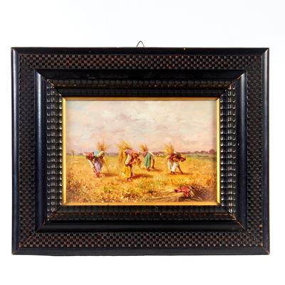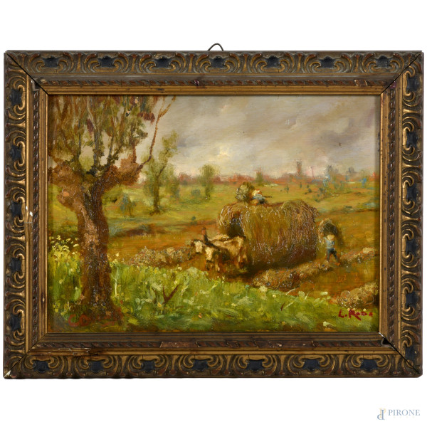 La Raccolta Del Fieno, Olio Su Compensato, XX Secolo, Firmato In Basso A Destra, CM 16 X 22 Entro...