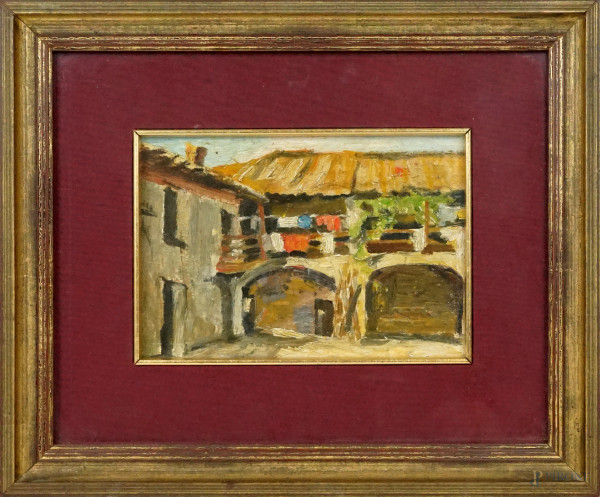 Paesaggio Con Case, Olio Su Tela, XX Secolo, CM 30 X 35 (Difetti)