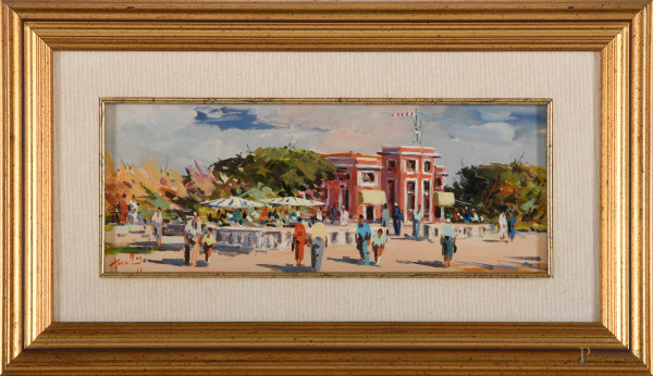Un Pomeriggio Assolato Al Parco, Acrilico Su Tavoletta, XX Secolo, CM 11 X 29 Entro Cornice, Firm...
