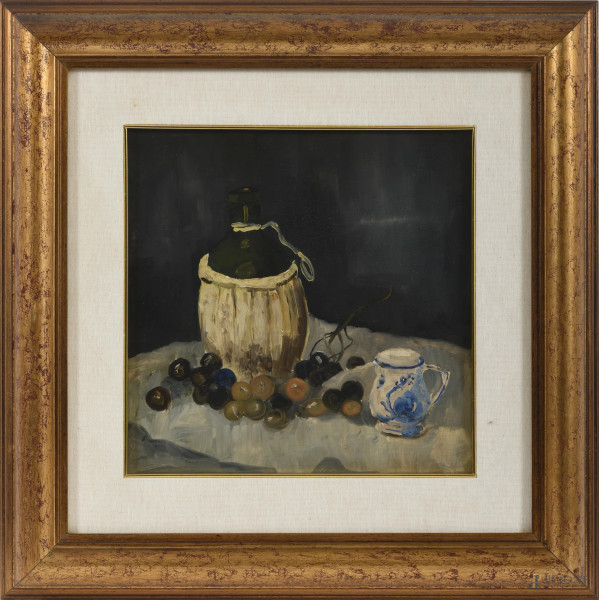 Natura Morta Con Fiasca E Uva, Olio Su Cartone, XX Secolo, CM 30 X 30, Entro Cornice