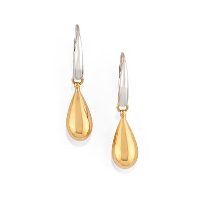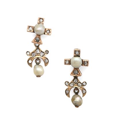 Coppia di orecchini pendenti in oro, perle naturali e diamanti