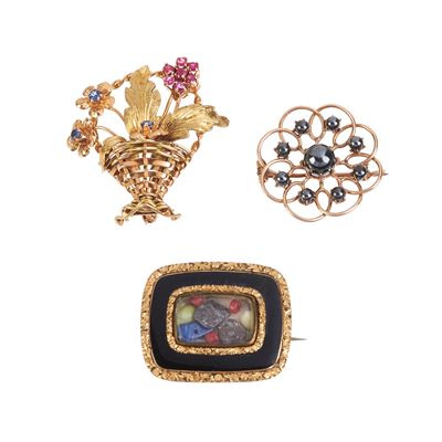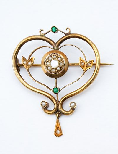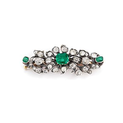 Spilla di ispirazione floreale in oro a basso titolo, argento, diamanti e smeraldi