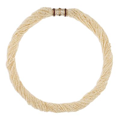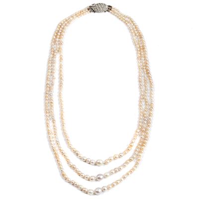 Rara collana a tre fili in perle naturali degradè, platino e diamanti