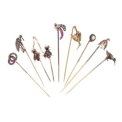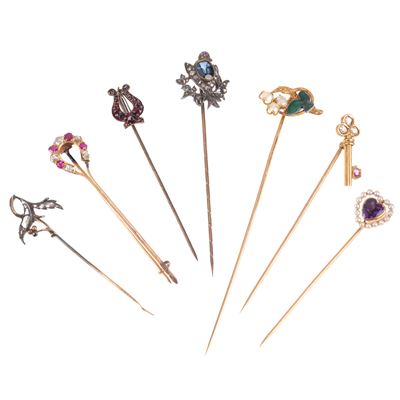 Sette spille da cappello e cravatta in oro 18kt, oro basso, argento, diamanti, rubini e granati