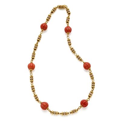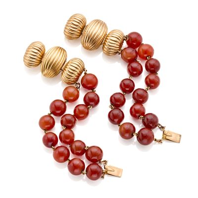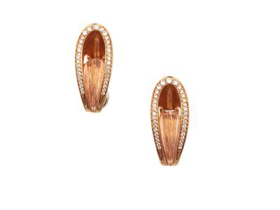 ORECCHINI 'APINE' IN ORO GIALLO 18 KT E DIAMANTI APPOGGIATE SU DUE SPOLE DI CORALLO A CONFETTO
