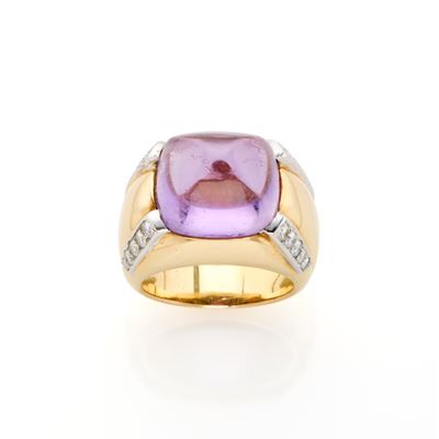 Lotto composto da tre anelli con gemme sintetiche, vetri blu e ametista taglio cabochon