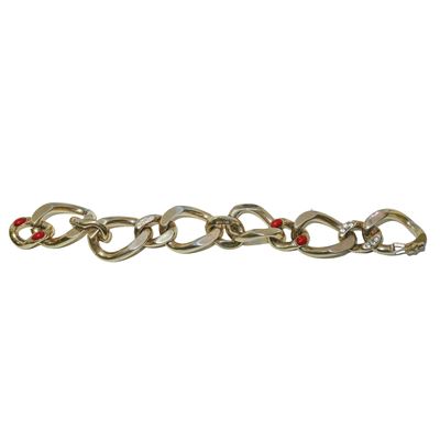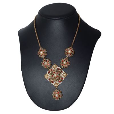 Collana con catena dorata e filigranata, pietre rosse , perle e strass