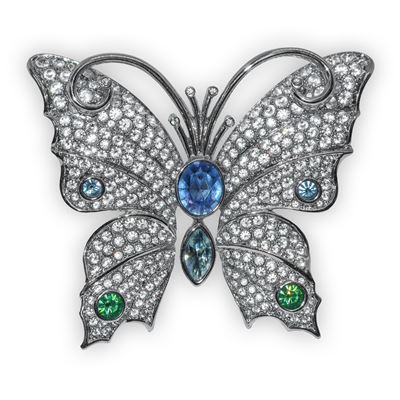 Spilla raffigurante un colibrì in metallo dorato, smalti policromi e strass