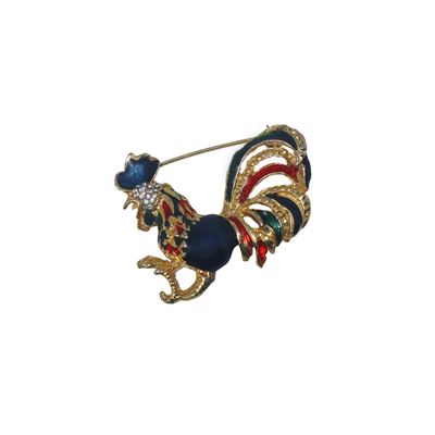 Spilla di un gallo in metallo dorato, smalti policromi e strass