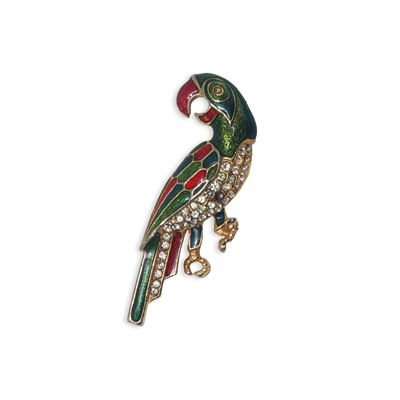 Spilla di pappagallo in metallo dorato, smalti policromi e strass