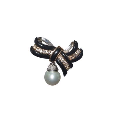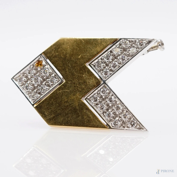 Pomellato, spilla a foggia di freccia in oro 18 KT con brillantini, di cui uno color giallo, cm 4...
