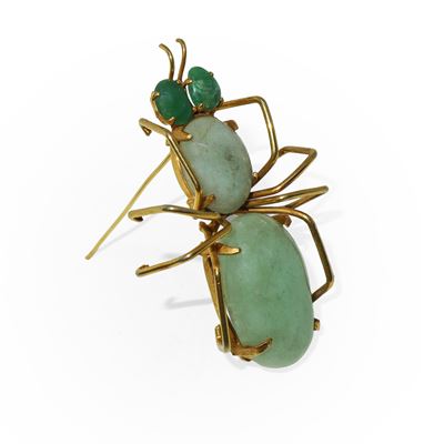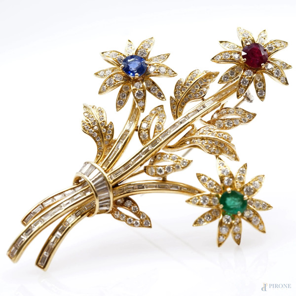 Chaumette, spilla in oro 18 kt a foggia di bouquet di fiori, con smeraldo, rubino, zaffiro, diama...