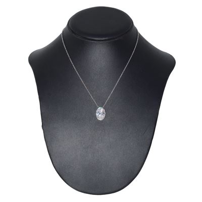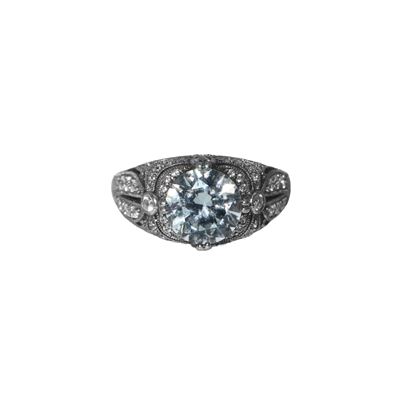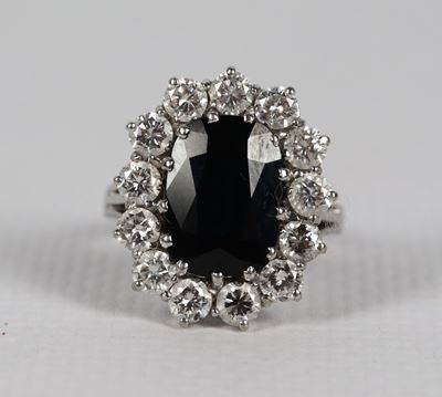 Anello in oro bianco 18kt con zaffiro ovale contornato da tredici diamanti taglio brillante ct 1,...