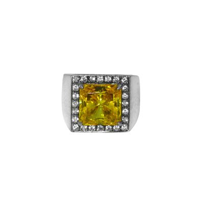 Anello chevalier in argento con pietra gialla al centro circondata da zirconi