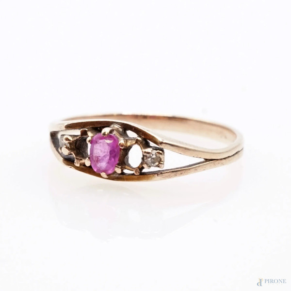 Anello In Oro Basso Centrato Da Radice DI Rubino Ovale E Due Brillantini, Peso Gr.1,9, Misura 16.