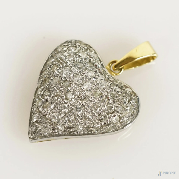 Ciondolo a forma di cuore in oro bianco e giallo 18 KT impreziosito da brillantini, cm 3,3x2,4, p...