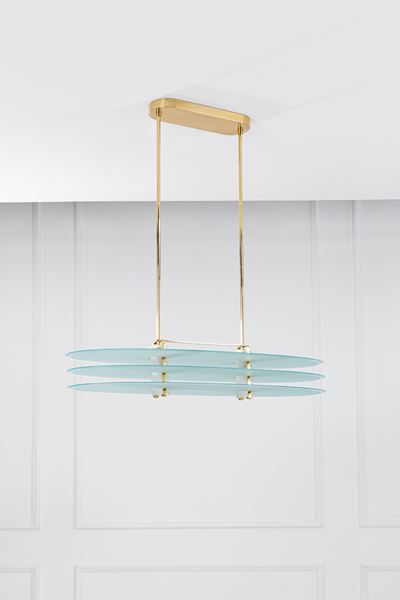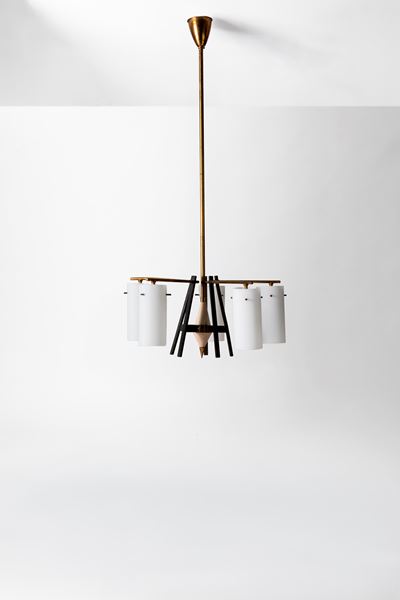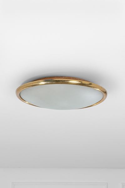 Max Ingrand, Grande plafoniera mod. 1447, metallo verniciato, ottone e vetro satinato