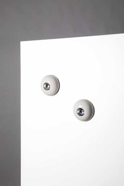 Vico Magistretti, Coppia di lampade da parete modello 'Olga', alluminio pressofuso e plastica, 19...