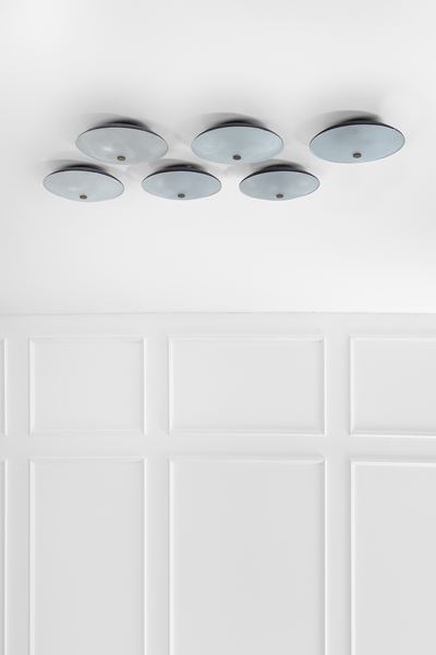 Gino Sarfatti, Cinque lampade a plafone modello 3030, alluminio laccato e vetro opalino satinato