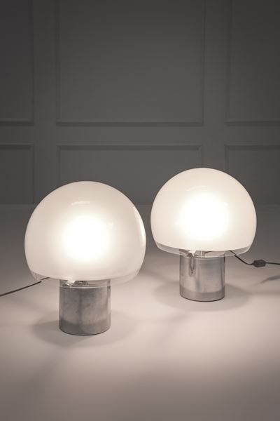 Luigi Caccia Dominioni, Due lampade da tavolo mod. LTA6 Porcino, ottone cromato e vetro soffiato,...