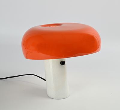 Lampada da tavolo, base in marmo bianco e paralume in metallo laccato arancione