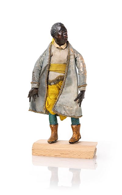 Paggio moro con lunga giacca di seta avorio con interno a righe