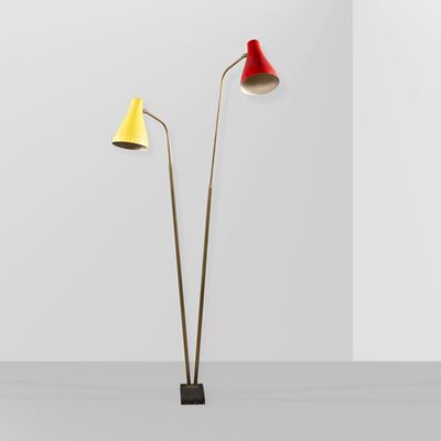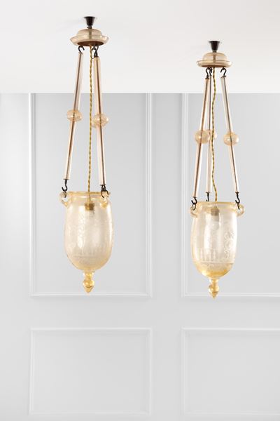 Coppia di lampadari a mongolfiera in metallo dorato e vetro. XIX secolo