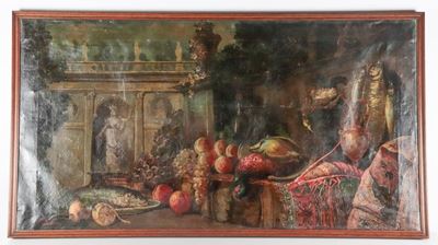 Firmato. "Natura Morta Con Architetture, Frutta, Pesci E Crostacei"