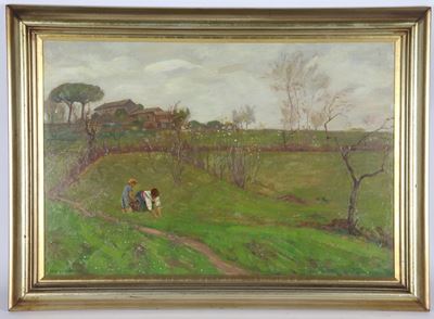 Firmato. "Paesaggio DI Campagna Con Staccionata E Contadina"