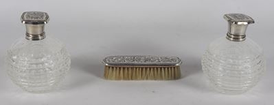 Lotto DI Due Bottiglie Portaprofumo E Una Spazzola Da Toletta In Cristallo E Argento (3 Pz.)